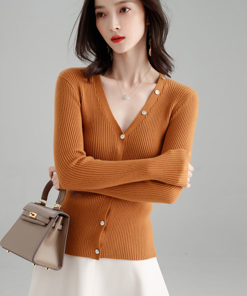 デコルテが語る女性らしさ 褒められニットカーデネックラインのボタンデザインがコーデを惹きたてるオシャレなアクセント!こだわりのシェルボタンボタンは、本物の貝から作られたものを使用!角度によって虹色のような光の反射が美しく、上品さを引立てくれます!リブニットとの相乘効果で高級感のある仕上がりに◎アクセントとして効果的なデザインです。バインダー仕様前立てから首周りはバインダー仕様となっていて、ネック周りはスッキリシルエットに◎表情豊かな着こなしが楽しめるボタンの開閉で表情を変えることができるカーディガン、少し深く開いたVネックなのでインナー次第で違った表情にも◎リブ生地特有のタテ線が痩せ見え効果抜群でスタイルアップのポイント。フィット感を持たせつつ、ストレッチがたっぷり効いてるので着心地ラクラク!■カラーアイボリー、ブラック、ブルーグレー、ブラウン、キャメル■素材感なめらかな肌触りで、保温性もストレッチ性も高くトレスフリーな着心地。洗濯:手洗い可ストレッチ性有り。光沢有り。【 ニット素材について 】敏感肌の方や個人差により、着用の際チクチクと感じられることがございます。あくまでも、ニット素材―アクリルやウール等の素材が含まれる場合がございますので、インナーのご着用をおすすめしております。ご注意くださいませ。