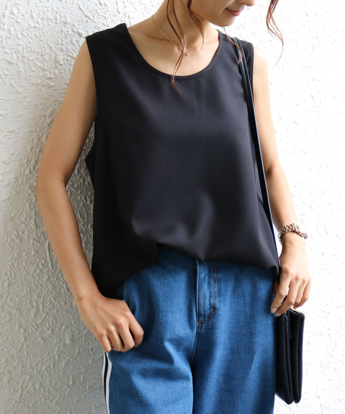 さらっとした滑りの良い質感と、てろっと落ちる「とろみ感」が印象的!デシン素材を使用したシンプルなノースリーブが入荷しました♪Uネックで、ヒップが隠れるロング丈。薄手なのでウエストインにもピッタリ!カジュアルにもキレイめにもコーデできる万能なベーシックアイテムです♪※アームホールの開きが少し広めです。インナーをご着用ください。※撮影時のライティング、ご覧になっているモニター・PC環境により実際の商品と色味が異なって見える場合がございます。ご了承の上お買い求め下さい。≪備考≫伸縮性:なし透け感:薄い色あり生地の厚さ:薄手肌ざわり:さらっとしているその他:デシン素材てろっとした落ち感あり滑りの良い質感
