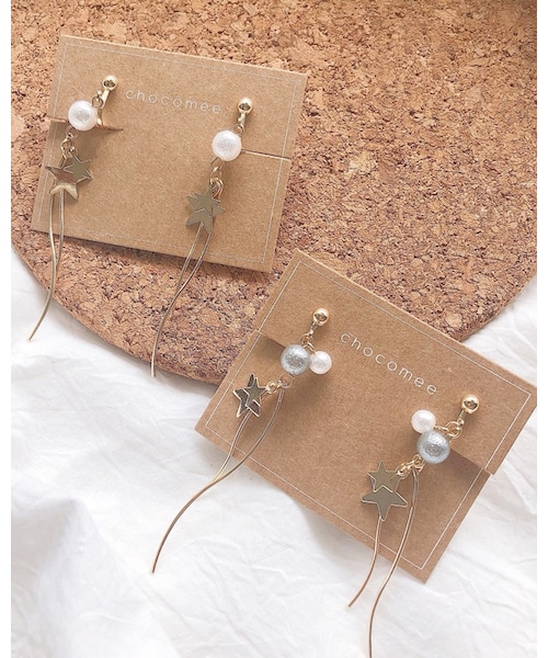 流れ星のようになったイヤリング/ピアス。 白の方はパールが1つ、グレー(ネイビー)の方はパールが2つついています。 こちらはピアス/イヤリングからお選びいただけます。