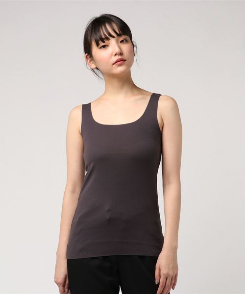 衿や袖ぐり、裾のカットオフ始末でシームレスに仕上げたタンクトップです。しなやかなストレッチ性も相まって、ボディに優しく馴染む快適なフィット感が楽しめます。インナー使いだけではなく、カットソーやリブニットに重ねたレイヤードコーデのアクセントとしても活用できるアイテムです。