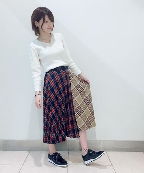柄・シルエットが異なったスカートをドッキングさせたようなデザインが目を引くチェックスカートです。片方はプリーツスカート、片方はヘムスカートと角度によって違った表情を楽しめます。シンプルなトップスやローファーと合わせてスカートを主役にしたコーディネートがおすすめ。ニットはもちろん、デニムシャツなどとも相性抜群です。