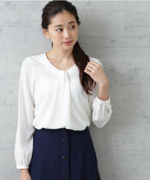 フロントネックに立体的なデザインを施したプルオーバーブラウス。適度な落ち感のある素材が美しいシルエットを生み出します。滑らかな肌触りに、体のラインを拾わないゆとりのあるシルエットで着心地も快適。一枚着としてはもちろん、フロントデザインがポイントになりジャケットINにも最適です。特にカラーレスジャケットとの相性は抜群‼