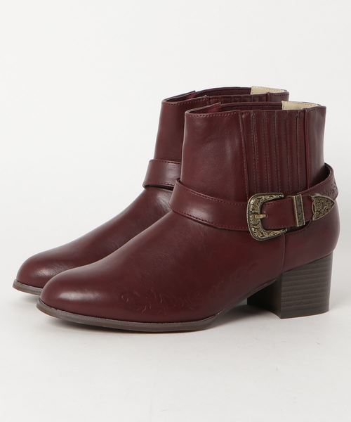 プリーツ状のゴム部分のデザインが新鮮なサイドゴアブーツです。アンティークなバックルベルトとさり気ない型押しがaxesfemmeならではの一足です。