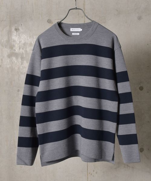 カットソーライクに着こなせるニットアイテム 春夏でも人気の高かったタフニットが秋冬も登場。 国内でも1社しか編めない特殊な編地は、洗濯からタンブラー乾燥まで可能にする非常に珍しいニットです。 洗濯からタンブラー乾燥まで可能にする非常に珍しいニットです。 定番のボーダーパターンをやや太めのピッチにすることでインパクトを出し、一枚での着用はもちろんインナー使いやシャツとのレイヤードなど幅広いコーディネートに対応できます。 ポリエステルをブレンドすることでクリアな目面が生まれ、キレイ目な印象に仕上げた一着。 ※洗濯方法は必ず付属のアテンション及び洗濯表示をお確かめの上お取り扱いください。
