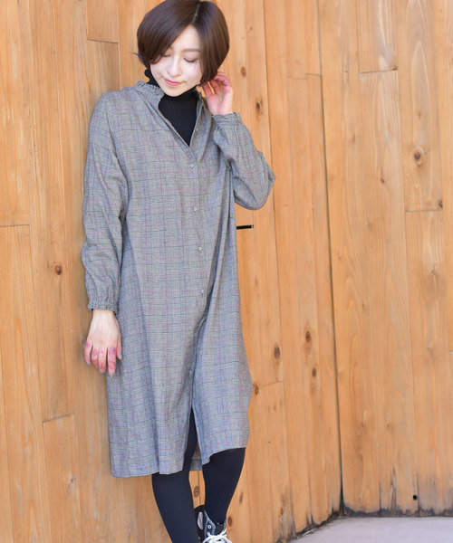 コーデの幅が広がるボタン開きのハイネックワンピース ふんわり優しい肌触りのフランネルコットンを使用したワンピース。 レッドはネイビーとのチェック柄、ブラック系その他2はグレンチェック、ブラックは無地の3パターンをご用意しました。 フロントボタンなので着こなしの幅が3倍に。 ノーマルなワンピース、前ボタンのワンピース、前を開けて羽織で。 その日の気分や合わせるアイテムで着回しをお楽しみください♪ フリルのハイネックと袖口でガーリーな雰囲気に仕上げました。 裏地なし 伸縮性なし 薄手 ボタン開閉可 袖口ゴム仕様 織りキズやだま等みられる場合もございます 洗濯:洗濯機使用可(ネット使用)