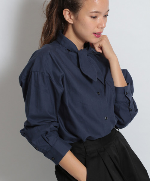 結びデザインの襟元が可愛い、ビッグサイズで旬なムードのデザインシャツ。取り外してスタンドカラーシャツとしても着られる襟にはやわらかいワイヤーを入れ、形がきれいに決まるようになっています。真面目でフェミニンな雰囲気のシャツには、トレンチコートやレザーシューズなどきちんと感のあるアイテムを合わせてトラッドに着こなすのが今シーズンはおすすめ。