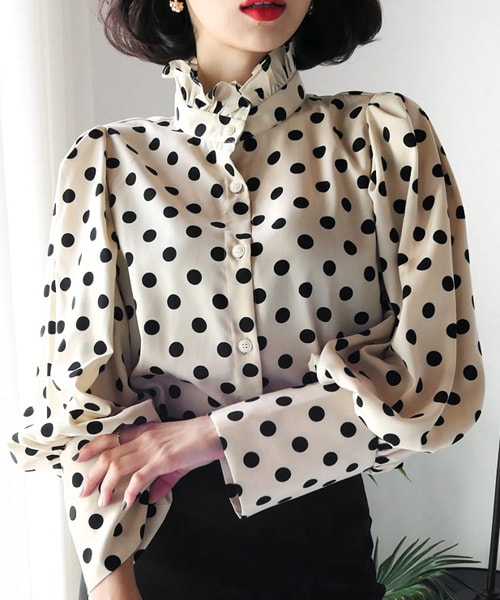 フリルハイネックが可愛らしいドットブラウス♡ レトロな雰囲気漂うデザインと袖口にこだわった華やかな一枚です。スカートにインしてレディなコーデでまとめるのが◎ ※WEARに記載してある金額と、DHOLIC通販サイトに記載してある金額にシステム都合上、稀に誤差が生じます。正しい金額はDHOLIC通販サイトに記載された金額です。