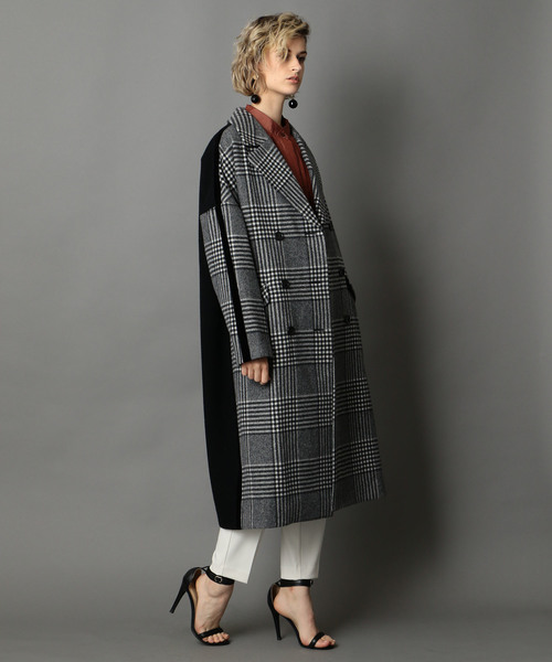 無地とグレンチェックの異素材を切り替えたコートにです。 全体的にモノトーンカラーなのでカラーのインナーとも合わせやすくなっています。 切り替えにはアクセントにベルベッドテープをたたきつけたこだわりのウールコート。