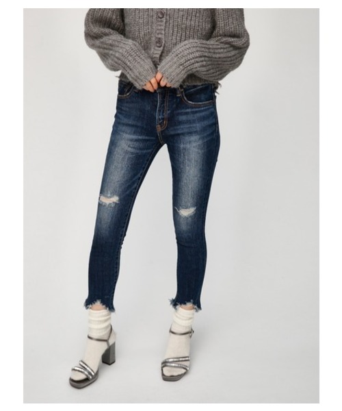 【JW fringe Skinny】 デニムらしい表情をしたしっかり厚みのある日本生地を使用。 ストレッチの効いたスリムシルエット。 裾のランダムなフリンジがポイント。 ジャストウエスト、ナチュラルな加工感にこだわったスキニー。裾はランダムカット仕様。