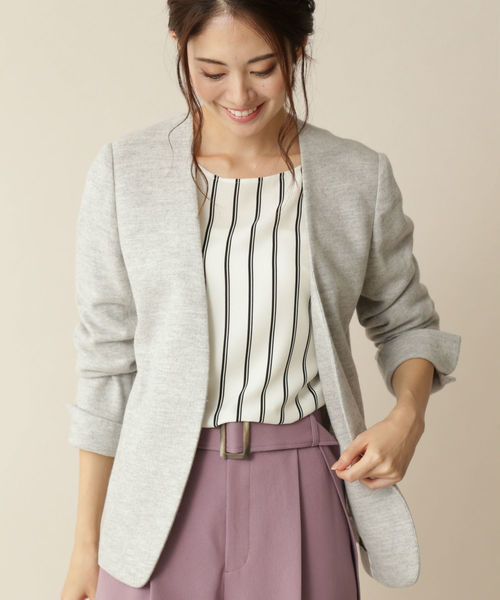 軽くて暖かい。ウール100%のリッチな素材で作るジャケットはさらっと羽織るデザインに仕上げました。通勤スタイルに軽く羽織ってもOK!インナーにボーダーやカットソーとあわせた大人カジュアルスタイルに仕上げてもOKと万能なジャケットです。圧縮ジャージーの素材感を活かして、裏なしにして縫い代をパイピング仕様にしています。