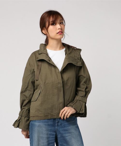 ミリタリージャケットをフリル袖で可愛く仕上げたアウター☆ コットン100%生地を使いナチュラルな一着に! ゆったりとしたシルエットでさらっと羽織るのに便利です♪