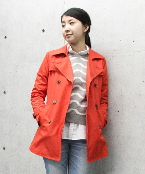 高密度でシャンブレー調のコットンギャバジンを使用したシリーズ。ハーフトレンチコートのベルト付きです。女性らしい細めのディテールにしています。パキッとしたカラー展開になっています。A0741FJM215 model:身長168cm 着用サイズ:M