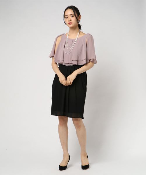 配色デザインが目を惹く、高級感あるネックレスがセットになった定番ドレス。 軽やかなシフォンジョーゼット素材を使用しており、フェミニンで上品な印象なので華やかなシーンにぴったりのドレス。 ノースリーブにしたり二の腕を覆うケープにしたり2WAYで着方もアレンジ可能です。