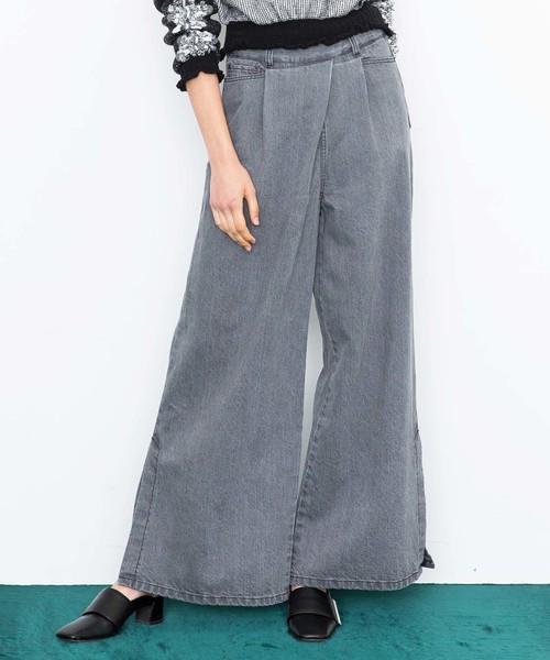 -design-アシンメトリーな前身頃が個性的なデニム。ラップの様なデザインで、1枚で着てもサマになります。サイドスリットが深めに入っているので、軽やかな印象に。オールシーズン着られるように、厚すぎず、薄すぎない生地を使用。ウエストはゴールドのジップで着脱可能です。ブラックデニムなので、カジュアルになり過ぎず、モードに着られるのも魅力です♪