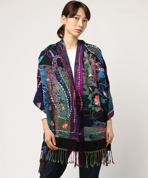 インド製のジャガード織りと花刺繍が入ったフォークロアテイストたっぷりのケープ。前でストリングを留めたり、首に巻いてストールとしてもお使いいただけます◎繊細な模様、華やかな毛糸の手刺繍がワンランク上のエスニックスタイルを演出します◇◆ ※こちらの商品は1点1点職人による手作りとなります。その為、生地の取り方により柄の配置や形・色合いなど若干異なる場合がございます。(画像は一例です。)あらかじめご了承ください。 Amina Collection Co.,LTD.