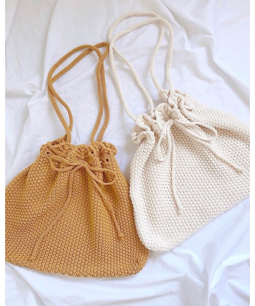 ニット素材のかわいい巾着型のトートバッグ。 秋冬にぴったりでリボンがアクセントになります。 コーデの差し色になるイエローもおすすめです。 ※持ち手が細いので重いものを入れるのはおすすめできません。