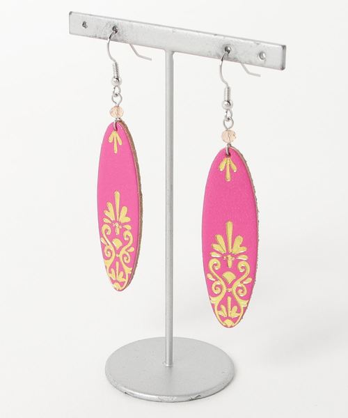 遊牧民が身につけるアクセサリーをイメージしたデザイン。広大な大地で力強く生きる精神力と、無垢な心の繊細さを表現。楕円形のレザーに箔プリントでエスニックな模様をあしらいました。顔周りを華やかにしてくれるピアスです。 ※こちらの商品は1点1点職人による手作りとなります。その為、形や色合いなど若干異なる場合がございます。あらかじめご了承ください。 Amina Collection Co.,LTD.