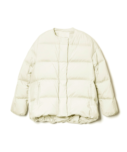 【ESTNATION(エストネーション)】 Aラインのシルエットが新鮮なオリジナルのダウンジャケットです。 しなやかでふくらみのあるパウダリーなタッチ、上品でソフトな風合いが特徴の、はっ水加工を付与した高機能素材。 首元はすっきりとノーカラーで、丈は今年トレンドの短め丈です。 少し後ろに抜けたように着用できるパターンで、お尻が少し隠れる前後差がついています。 カジュアルになりがちなダウンジャケットを、箇所によってダウンのボリュームを抑えてエレガントな印象に。 裾はテントラインで広がっているのがポイントですが、内側のゴムを調節していただければコクーンシルエットにも早変わり。 トレンドのパウダリーカラーが今年らしさ抜群の一着です。