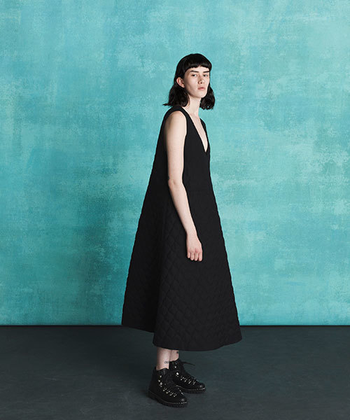 Washebleウールをプリマロフトでキルティングし、防水性と洗濯機で洗えるという実用性を兼ねたロングワンピース。アウターで使用することの多いキルティング素材を、あえてワンピースで使用した他に見ないアイテム。