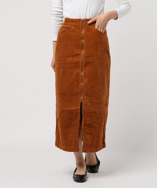 ■ミモレ丈が新鮮なタイトスカート■ フロントジップと深めのスリットのデザインが他と差がつく1枚。 ウエストゴムなのでラクに履いていただけます。 太めの畝とタイトなシルエットがカジュアルすぎず大人っぽく仕上がっています。 合わせるトップスでカジュアルにもフェミニンにも雰囲気を変えられるのも魅力的。