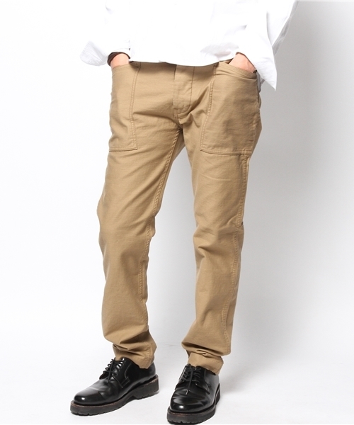 風合い豊かなサテン地を裏使いにすることで独特の素材感を出すバックサテンを使用したパンツ。 細すぎず太すぎずの絶妙なストレートラインのシルエットは穿き易く、 短靴やブーツなど様々なスタイリングに活躍致します。 トレンド感のある迷彩柄も今季はご用意!春先のコーデのアクセントに。 店舗へは下記品番でお問い合わせ下さい。 品番:14030600876010 ※画像の商品はサンプルです。 実際の商品と仕様、加工、サイズが若干異なる場合がございます。 model:身長178cm 着用サイズ:LARGE ホワイト・ベージュ model:H175 B73 W71 H80 着用サイズ:MEDIUM