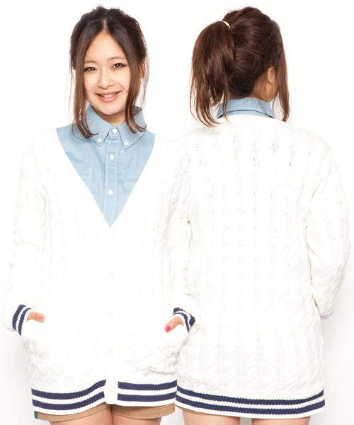 コットンニットのVネックカーディガンは、おしりが隠れるロング丈。立体感のある女の子らしいケーブルに、ライン入りリブとカレッジロゴワッペンを叩いたX-girlらしいカジュアルなデザイン★