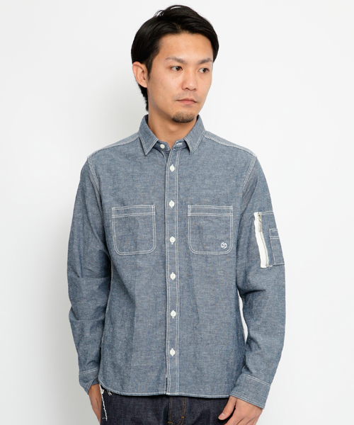 今シーズンらしい麻混のダンガリー素材を使用したワークシャツ。ミリタリー要素のMA-1ポケットを左袖に配したMIXデザインとなっている。ポケットに使用されているエクセラファスナーはムシ部分を磨きかけてあり上品な光沢を醸し出し、全体の印象もキレイ目に見せる。シャツにおいては太番の20番ステッチを用い、3本針巻きカン縫い仕立てでパッカリングを出して仕上げている。 model:身長173cm 着用サイズ:2