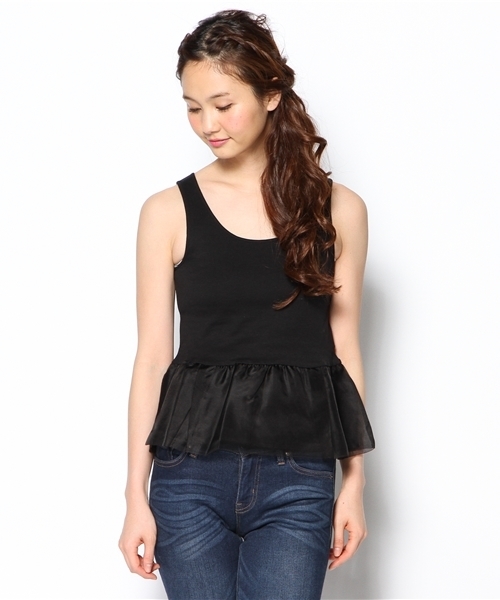 オーガンジーぺプラムタンクトップ☆ 裾にオーガンジー生地のぺプラムを施したキュートなタンクトップ。 トップス部分はスッキリとしたシルエットで、ニットにレイヤードしたスタイリングにピッタリ! 今シーズントレンドのショート丈トップスとの相性バツグンの一着です。 model:H168 B80 W58 H86 着用サイズ:フリー ※着用、お取り扱いの際は商品についておりますアテンションタグ、洗濯ネームを必ずご確認ください。 店舗にお問い合わせの際は、全国のAnother Edition店舗まで 下記の品名/品番をお申し付け下さい。 品名:AE ORGANDYペプラム T/TOP 品番:56172012672