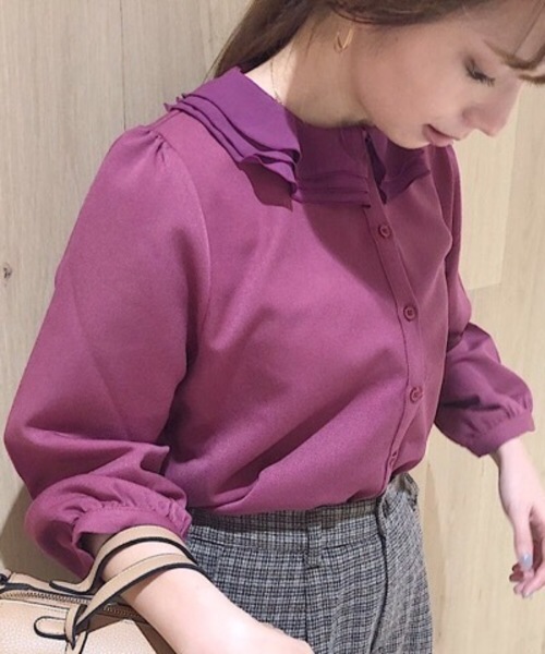 ゆらりと揺れるフリル衿が女性らしい華やか見えブラウスの登場です♪今季らしいチェック地のタイプは白い衿を合わせて抜け感を。顔周りが明るく見える効果も嬉しいポイントです。もう一色は華やかで女性的なホットピンクをご用意しました。絶妙にくすんだ落ち着いたホットピンクは肌馴染みよくきて頂けますので是非挑戦して頂きたいお色味です。身頃地と衿で素材を変えてお作りしているのもポイントです。秋冬でも軽やかにすっきり見えしたい部分には軽やかな素材を合わせております。コンパクトなサイズ感で袖丈も綺麗にブレスレットや腕時計が見えるバランスでお作りしました。デニム等のカジュアルなアイテムと着崩して合わせるのがおススメです。ミスカートと合わせたフェミニンスタイルもデート等に是非♪