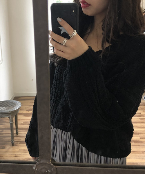 もこもことした素材感のケーブル編みのゆったりとしたトップス Vネックで顔周りもすっきりな印象に! また、シャツやハイネックのインナーのレイヤードもしやすいサイズ感がうれしい♪♪