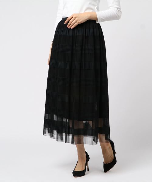 シアー感のある素材がシックな雰囲気に華やかさを添えるスカート。細やかにプリーツを施した縦のラインとワイドなボーダー柄の横線が重なり合い、絶妙なコントラストを織りなします。ウエスト部分はゴム仕様で、リラックス感のある履き心地も嬉しいポイント。ペチコートとのバランスも美しく、パーティーシーンにもおすすめの1枚です。