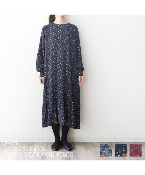 落ち感のあるレーヨン素材の生地にクラシカルなフラワープリントが大人っぽい印象のティアードワンピース。 歩くたびに動きの出るシルエットが女性らしい印象です。 一枚で着るのはもちろん、パンツをレイヤードしたスタイルもバランスよくきまります。 寒い時期にはボリュームあるニットやジャケットを合わせても。 今年らしい雰囲気で着こなせる一着です。 * モデル163㎝・160㎝ 素材レーヨン100%(裏地なし) 身丈114㎝/ 身幅56㎝/ 肩幅38㎝/ 袖丈58㎝/ 洗濯方法・・手洗い