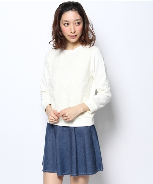 先シーズンに引き続き今年も裏毛素材が大人気!スウェットと同じくトレンドキーワードであるレースをフロントに重ね、フェミニンテイストに仕上げています。シンプルなラウンドネックで使い勝手も◎。今年らしく着るならスカート合わせがおすすめです。 品番:BVM1405(ショップにお問い合わせの際お伝え下さい。) model:H171 B82 W60 H85 着用サイズ:MEDIUM