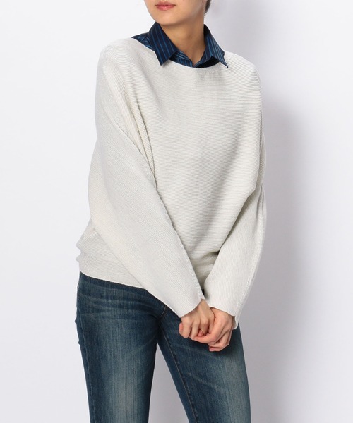 継ぎ目のないホールガーメントのパール編みプルオーバーニットです。 ドルマンスリーブのやや大き目のシルエットが今年らしい雰囲気で前後で違う襟開きで2WAYで楽しめます。 編地全体に日本製の細番手ラメを入れ、カジュアルに見えすぎない工夫をしています。