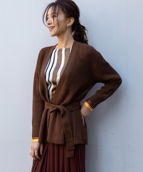 ざっくりとしたローゲージあぜ編みと、肩の落ち感が今年らしい程よいカジュアル感を醸し出した、ミドル丈の着流しカーディガンです。 リボンベルトでウエストマークをして、フレアーヘムで少しふんわり感を出した着こなしも素敵ですが、ブラウスに前を重ねずにバサッと羽織らせる抜け感のある着こなしもオススメです。バックにロゴプレートあり。