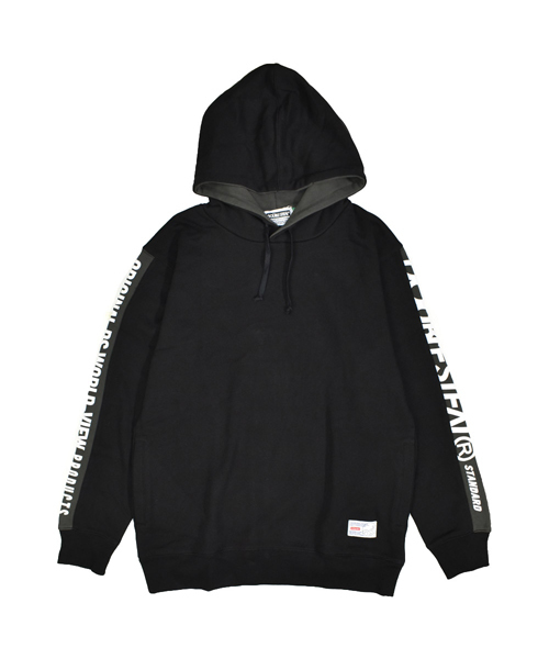 両袖にラインを施したパーカー。ラインには左右違うプリントが入る。サイドポケットも付き機能性もあり。ピスネームも付いたスポーティーなパーカー。