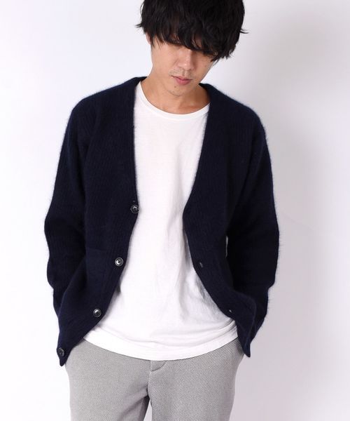 保温性の高いとされるタヌキを高混率でブレンドしたカーディガントラディショナルなアゼ編みながら衿や前立てをフラットに仕上げることで抜け感を演出。シンプルながらアゼ編みならではの凹凸感は存在感を引き立たせます。ナチュラルなカラー展開でコーディネートに馴染みやすく、秋口のメインから冬のインナーまで幅広くこなす万能な一着。※毛が他の物に付着しやすいため、その際はブラッシング等で除去してください。グレー、カーキ model: H177 着用サイズ: LARGEネイビー model: H170 着用サイズ: MEDIUM