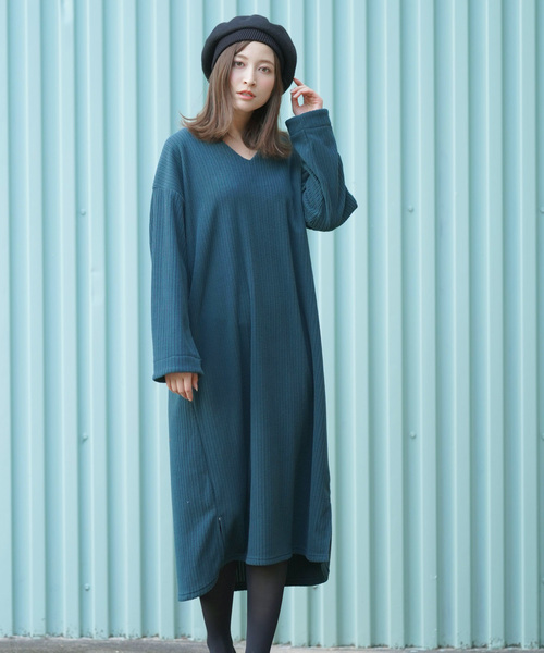 ★大人シックな【ダークグリーン】が仲間入り★ シンプルで使えるVネックの起毛ロングワンピース シンプルなデザインが使いやすいロングワンピース。 すとんと落ちる長めのシルエットが着こなしにこなれた表情を与えます。 また、前後V開きの襟がネックラインを女性らしく演出。 暖かな起毛素材にストライプ状に針抜きを施したことで表面感をつけてすっきりとした印象を与えます。 足さばきの良いサイドスリットが足元にも表情をプラス。 レギンスやパンツとの重ね着にもピッタリです♪ 裏地なし 伸縮性あり 薄手 起毛あり 洗濯:手洗い可