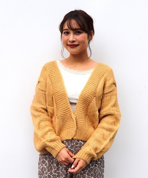 キラキラとオーロラのように繊細に輝く、可愛らしさ溢れるニットカーディガン♪たぷっとしたボリュームのある袖と短めの着丈で、flowerらしいデザインに仕上げました。 ゆるっとした肩が落ちるシルエットが肩回りを華奢に見せてくれます。 身頃に入った大きめのケーブル編みが暖かみのある、目を惹くデザインポイント! ゆるっとしたサイズ感で中に着こめるので、どんなアイテムとも合わせやすい使い勝手抜群なカーディガンです。 フロントにはスナップボタン付きなので、前を留めてカシュクールのような着方もお楽しみいただけます。
