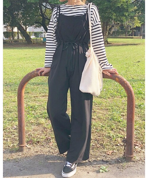 スウェット生地で動きやすいのオールインワン。 ラフなスウェットですが肩紐がリボンになっていたりウエストを絞れるのでスタイルアップでき、裾が切りっぱなしになっているのもポイント。