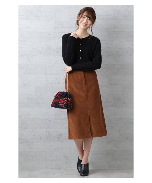 【steady. 11月号掲載】【sweet 11月号掲載】【otonaMUSE 12月号掲載】 今季トレンドのコーデュロイ素材を使用したストレートスカート。今っぽい長めのレングスに前スリットをあしらい、細身シルエットながら足さばきは良好。高めのウエスト位置に太幅のベルトデザインで、人気のタックインスタイルもお洒落に決まります。カジュアルになり過ぎないようきれいな表面感にこだわりました。きれいめトップスを合わせればオフィスシーンにも投入OK。