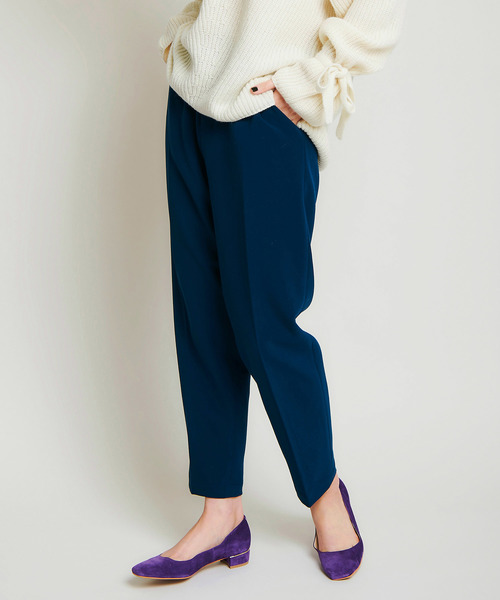 ◆華やかカラーが目を惹くテーパードパンツ◆さらりとした質感と上品な雰囲気を兼ね備えたダブルクロス生地を使用したテーパードパンツ。伸縮性もありシワになりづらいためデイリーに使える1本。すっきりとしたシルエットでスタイルアップ効果も抜群◎ウエスト後ろ部分はゴム入りで、きちんとして見えるのに楽な履き心地が魅力。ふんわりとした女性らしいニットと合わせるとトレンドライクな着こなしが完成!【洗濯表示について】洗濯処理はできません漂白処理はできませんタンブル乾燥禁止底面温度110℃を限度とし、スチームなしでアイロン仕上げ石油系溶剤(蒸留温度150℃~210℃引火点38℃~)でのドライクリーニング処理ができる:弱い処理ウエットクリーニング処理はできません※画像の商品はサンプルです。実際の商品と色味、仕様、加工、サイズ、素材等が若干異なる場合がございます。※アイテムサイズは商品サンプルを採寸しているため、実際の商品と多少の誤差が生じる場合がございます。※末永く愛用頂く為に、アテンションタグ・洗濯ネームを必ずご確認の上、着用又はお取り扱い下さい。