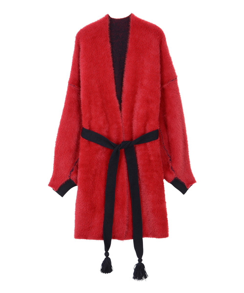 表と裏で表情や色がまったく異なるリバーシブルカーディガン。「リバーシブルファーニット」 シャギー糸と細番手ストレート糸を接結編みしたニットカーディガン。 ちょっとしたアウター感覚で着ることができます。ゆったりとしたシルエットや、ヒップがすっぽり隠れる安心感のある丈で、体型を選ばないサイズ感です。ONにもOFFにもどんなコーディネートにも、さらっと羽織れて様になる万能ニットです。表はファーのように毛がふき、裏はフラットでベーシックな見え方。表と裏で表情や色がまったく違う編地になっています。その特徴を活かし、リバーシブルで着ることができる仕様に仕立てました。 ホワイト×ベージュ、レッド×ネイビー、ブラウン×イエローの3色展開。ベーシック×差し色の配色が目を引き、コーディネートの幅も広がります。