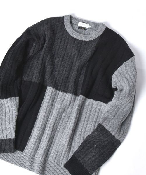 ◆カシミヤ混の紡毛素材を使用したジャカードニットの登場!◆ カシミヤをブレンドした、暖かく、さわり心地の良い一枚。 縫製では無く、ゴロつきの少ないインターシャでパッチワーク風の配色にしているので、ストレスなく着ていただけます! また、前身頃は配色の他に組織も変えており、表情豊かなデザインとなっており、存在感抜群! メイントップスではもちろん、コートやジャケットのインナーとしても存在感を出してくれるので、これからの季節にオススメです! ※袖部分の縫い目は異なるカラーでの縫製となっております。 予めご了承ください。