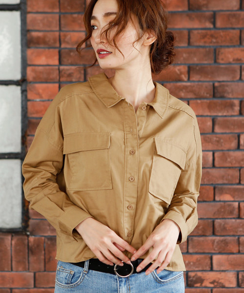 ずるっと抜き衿で着こなしたい ミリタリーテイストのシャツジャケット。 カジュアルコーデにピッタリで、一見メンズライクな印象ですが、 後ろ衿にボタン付きでさりげないカワイさも持ち合わせた1枚です。 絶妙なショート丈でスタイルアップ効果も。 少し色褪せた様なカーキとベージュの2色展開。 コーデ取り入れるだけで簡単にこなれた印象になるアイテムです。 *撮影場所やイメージにより実際の商品と色味が若干異なる場合がございます。商品のお色味はカラーバリエーション画像をご参照ください。