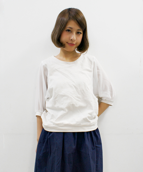 カットソー感覚で着れるTOPSアイテム!! ボディーは薄手の裏毛のスウェットを使用し、袖はシフォンの生地で切り替えて♪♪ 春らしい涼しさを感じさせるカットソーアイテムに完成させました!! 全5色の展開ですが、無地とチェックのパターンがあるのでシンプルと柄物で2つ欲しくなること間違いなし☆★ 身幅はややゆったりの丈はショートのデザインなのでコクーンスカートやタイトスカートにもバッチリ◎ 羽織ものアイテムのインナーにレイヤードしてもOK!! ●着用モデル:160cm ※画像の商品はサンプルです。 実際の商品と仕様、加工、サイズが若干異なる場合がございます。