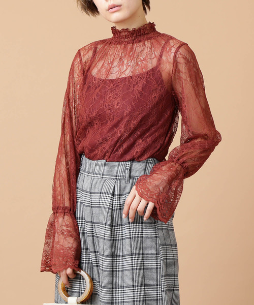 クラシカルなハイネックブラウスは、レースのシアー感が品良く女性らしいアクセントになっています。インナーキャミソールがSETで付いており、そのまま一枚でも着やすくなっています。カジュアルトップスと合わせて、襟ぐりとフレア袖を出したレイヤードスタイルもおススメです。※キャミソール有り