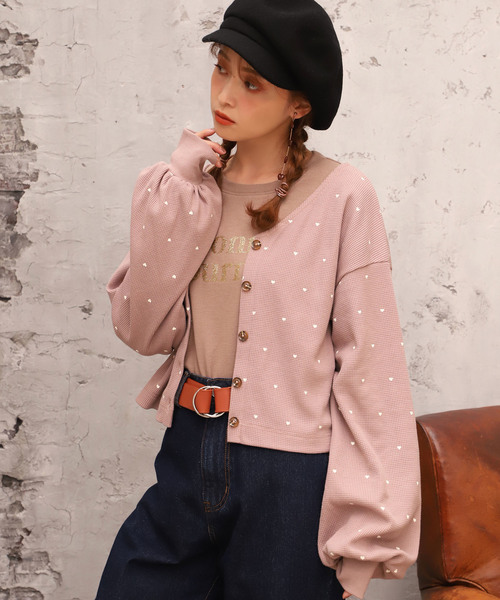 ~NICECLAUP 2018 Winter Collection~ ■散りばめられた♡プリントが目を惹くトレンドのサーマルアイテム。 プリントがポイントのサーマルカーディガン。 小柄な♡と袖のボリューム感でかわいいだけでなく、 Vネックがデコルテをキレイにみせて、抜け感もだしてくれます♡ カーディガン着用としてはもちろん、プルオーバーとしても着ていただけます。 サーマル生地特有の柔らかく軽い素材なので、冬にはアウターの中に着ても◎ ■スタイリング トレンドのタイトミディ丈のスカートと合わせることで、よりフェミニンな印象に。 カジュアル好きな方は、デニムパンツやワイドパンツに合わせると◎ 短めな丈感で、スカートからパンツスタイル、アウターとの組み合わせまで、 全体のバランスが取りやすいアイテムです。 ・サンプルでの撮影の為、実際にお届けする商品と仕様やサイズが異なる場合がございます。