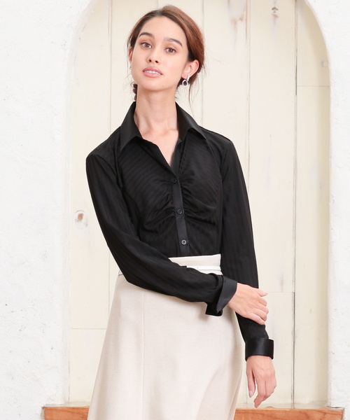 イタリアンジャージーの非常にストレッチの効いた素材を使った、胸ギャザーシャツ。体にもピッタリなじみ、レイヤードスタイルも上着がごろつかず着用できるのも特徴です。胸元のギャザーが、ふんわりとした立体感を作り出し女性らしいシルエットを演出。衿とカフスを別布でクレリックに仕上げました。布帛のシャツの堅苦しさから解放されるデイリーユーズおすすめの商品です。