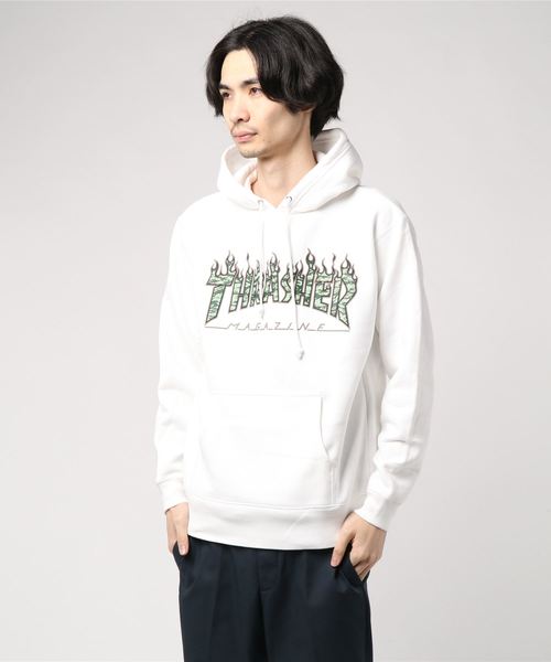 スラッシャーのフレイムロゴとカモフラをミックスしたパーカー。ストリートスタイルにマストなコーチジャケットなどとも相性抜群です。女性の方のオーバーサイズでの着用もおすすめです。【THRASHER】スラッシャー・マガジンから生まれたスケーターなら1度は憧れるハードかつ、クールなブランド。1981年にサンフランシスコでエドワーズ・リギンスが創刊して言わずと知れたUSAを代表するスケートボード専門誌「THRASHER MAGAZINE」。雑誌の刊行だけに留まらずそのブランドとしての地位は世界中の若者たちの間で確固たる物となっている。スケートボードだけの枠にとらわれずウェア、アートワーク、ロック、他のスライドスポーツ界に置いてもその独自の世界観はある種その手のサブカルチャーの代名詞にさえなっていると言っても過言では無い